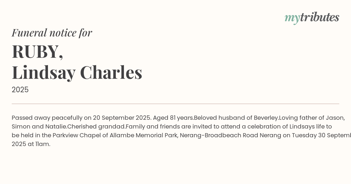Family and friends are invited to attend a celebration of Lindsay’s life to be held in the Parkview Chapel of Allambe Memorial Park, Nerang-Broadbeach Road Nerang on Tuesday 30 September 2025 at 11am.