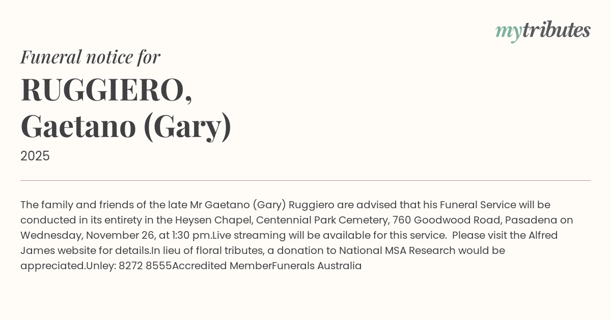 The family and friends of the late Mr Gaetano (Gary) Ruggiero are advised that his Funeral Service will be conducted in its entirety in the Heysen Chapel, Centennial Park Cemetery, 760 Goodwood Road, Pasadena on Wednesday, November 26, at 1:30 pm.