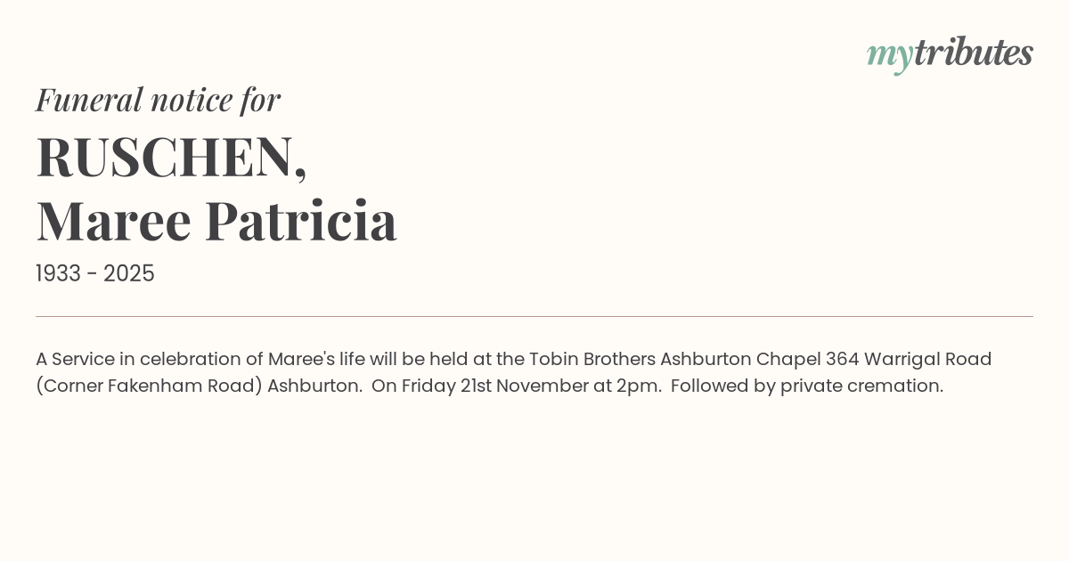 A Service in celebration of Maree's life will be held at the Tobin Brothers Ashburton Chapel 364 Warrigal Road (Corner Fakenham Road) Ashburton. On Friday 21st November at 2pm. Followed by private cremation.