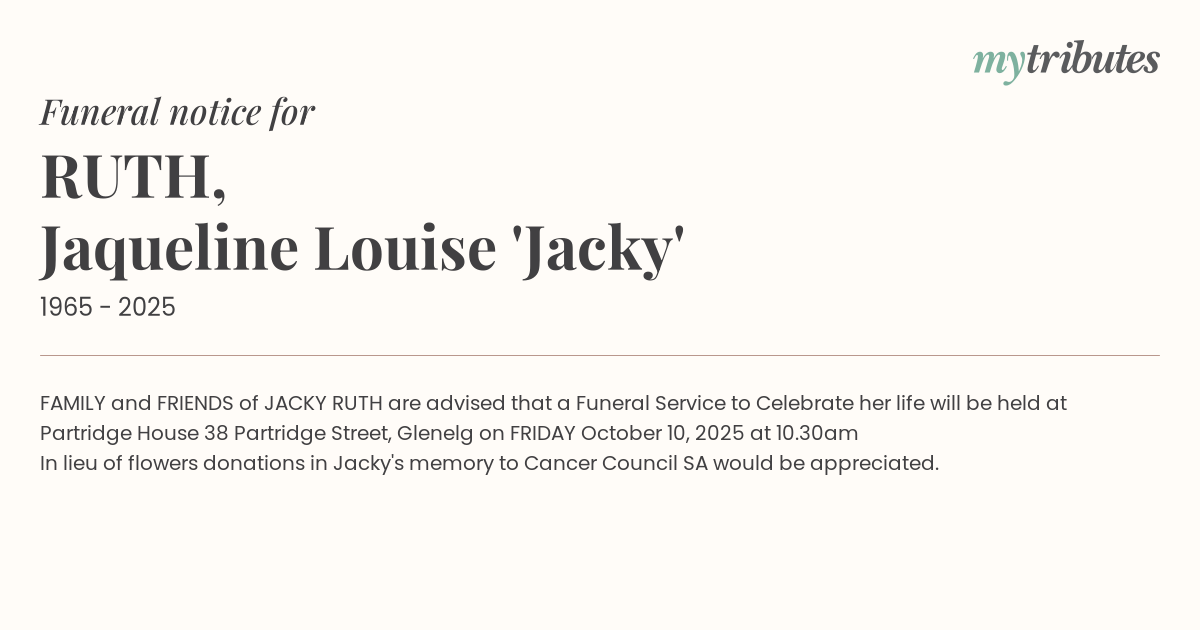 FAMILY and FRIENDS of JACKY RUTH are advised that a Funeral Service to Celebrate her life will be held at Partridge House 38 Partridge Street, Glenelg on FRIDAY October 10, 2025 at 10.30am