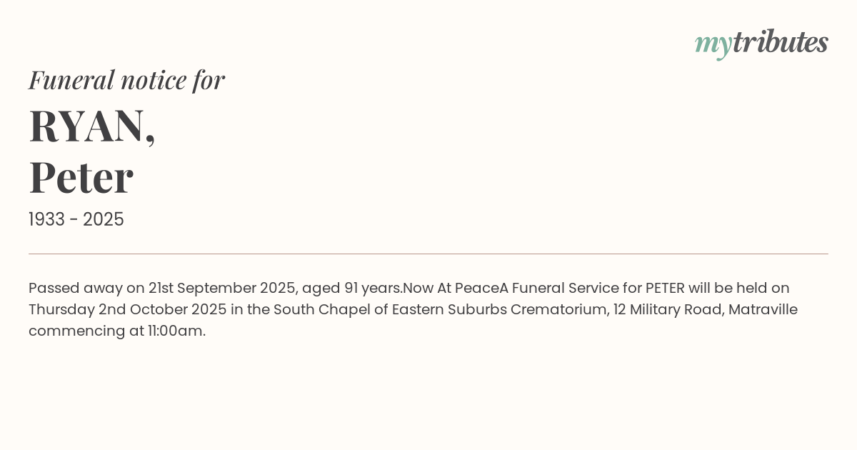 A Funeral Service for PETER will be held on Thursday 2nd October 2025 in the South Chapel of Eastern Suburbs Crematorium, 12 Military Road, Matraville commencing at 11:00am.