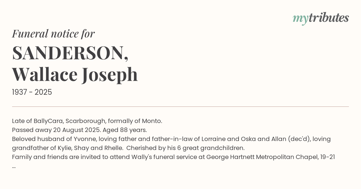 Family and friends are invited to attend Wally's funeral service at George Hartnett Metropolitan Chapel, 19-21 Anzac Avenue, Redcliffe on Friday 29 August at 2pm.