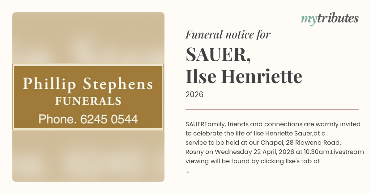 Family, friends and connections are warmly invited to celebrate the life of Ilse Henriette Sauer,