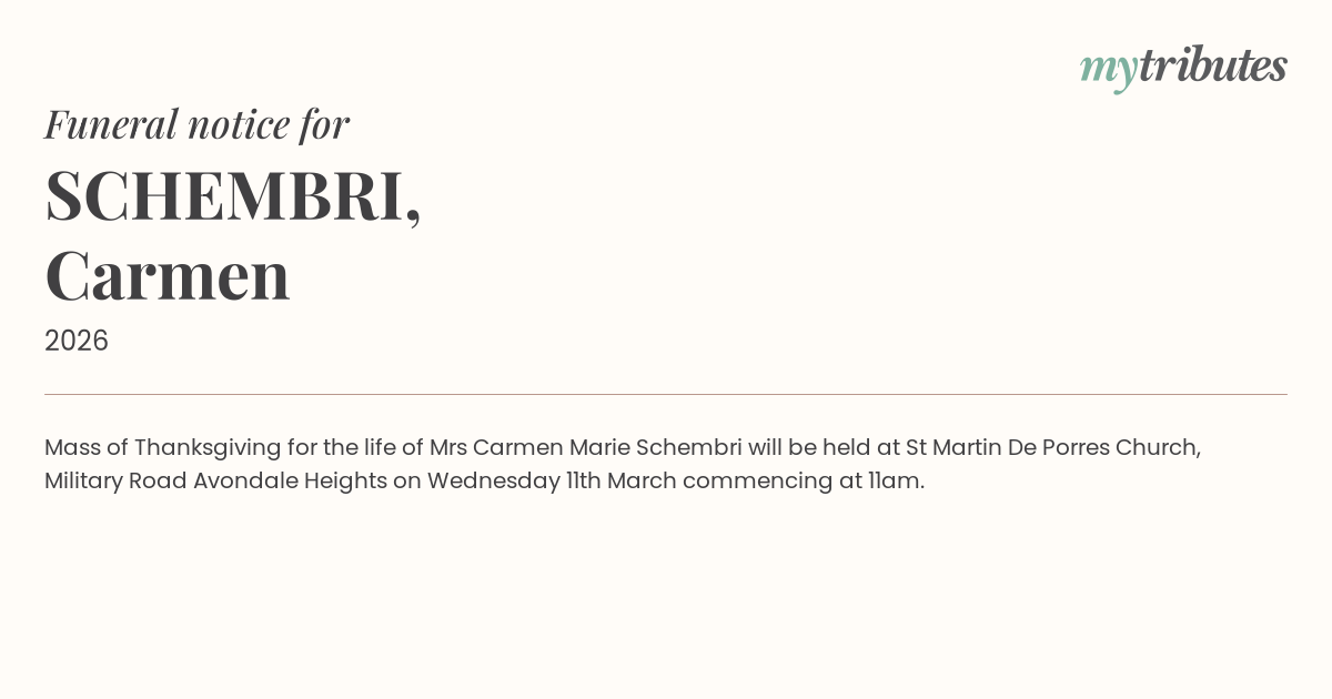 Mass of Thanksgiving for the life of Mrs Carmen Marie Schembri will be held at St Martin De Porres Church, Military Road Avondale Heights on Wednesday 11th March commencing at 11am.
