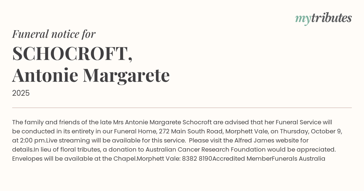 The family and friends of the late Mrs Antonie Margarete Schocroft are advised that her Funeral Service will be conducted in its entirety in our Funeral Home, 272 Main South Road, Morphett Vale, on Thursday, October 9, at 2:00 pm.