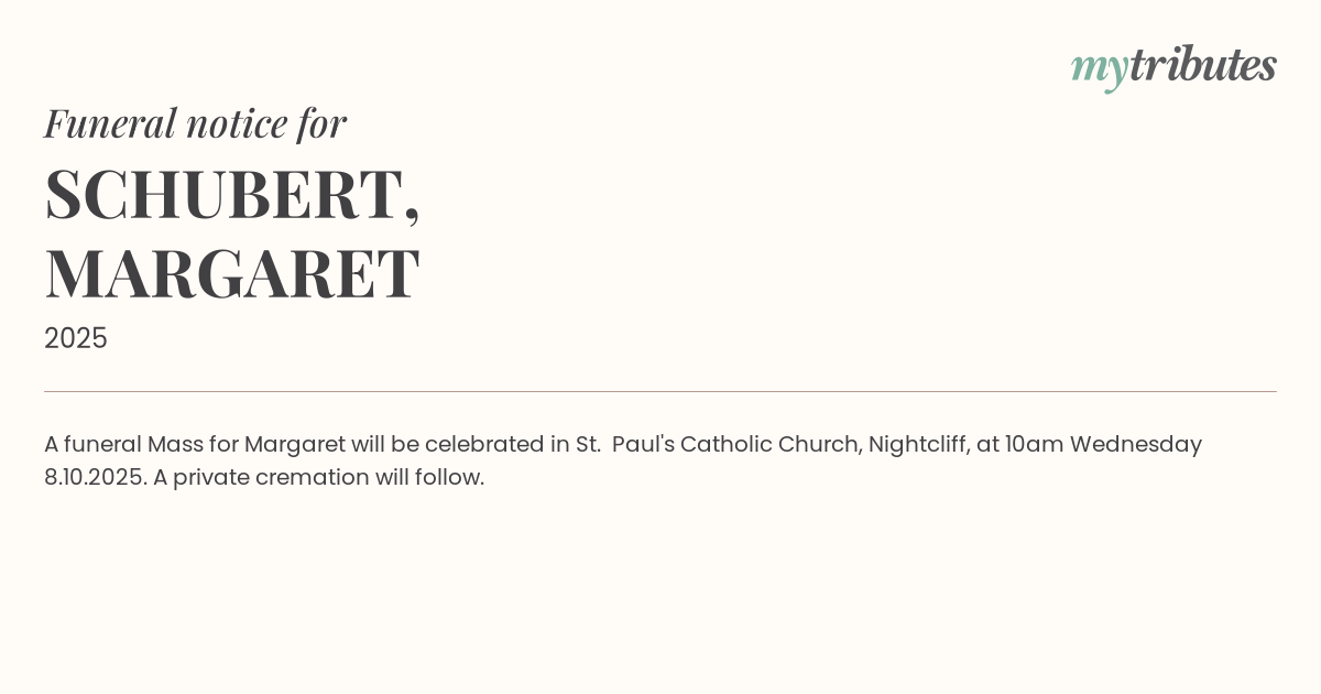 A funeral Mass for Margaret will be celebrated in St. Paul's Catholic Church, Nightcliff, at 10am Wednesday 8.10.2025. A private cremation will follow.