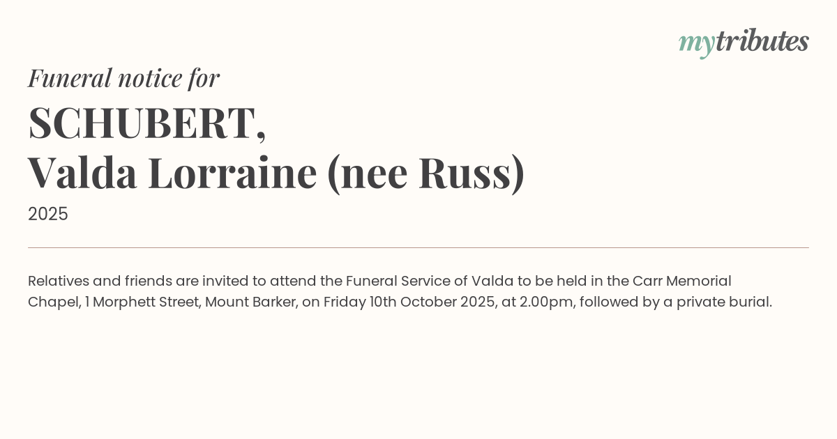 Relatives and friends are invited to attend the Funeral Service of Valda to be held in the Carr Memorial Chapel, 1 Morphett Street, Mount Barker, on Friday 10th October 2025, at 2.00pm, followed by a private burial.