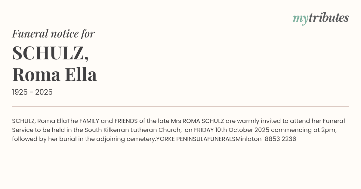 Mrs ROMA SCHULZ are warmly invited to attend her Funeral Service to be held in the South Kilkerran Lutheran Church,