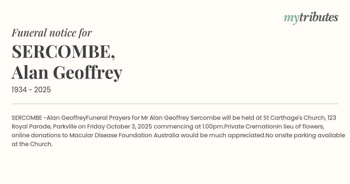 Funeral Prayers for Mr Alan Geoffrey Sercombe will be held at