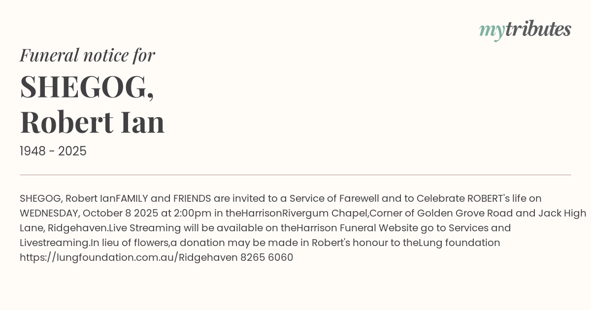 FAMILY and FRIENDS are invited to a Service of Farewell and to Celebrate ROBERT's life on WEDNESDAY, October 8 2025 at 2:00pm in the