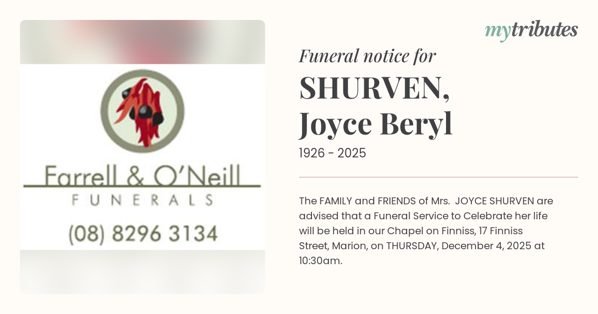 The FAMILY and FRIENDS of Mrs. JOYCE SHURVEN are advised that a Funeral Service to Celebrate her life will be held in our Chapel on Finniss, 17 Finniss Street, Marion, on THURSDAY, December 4, 2025 at 10:30am.