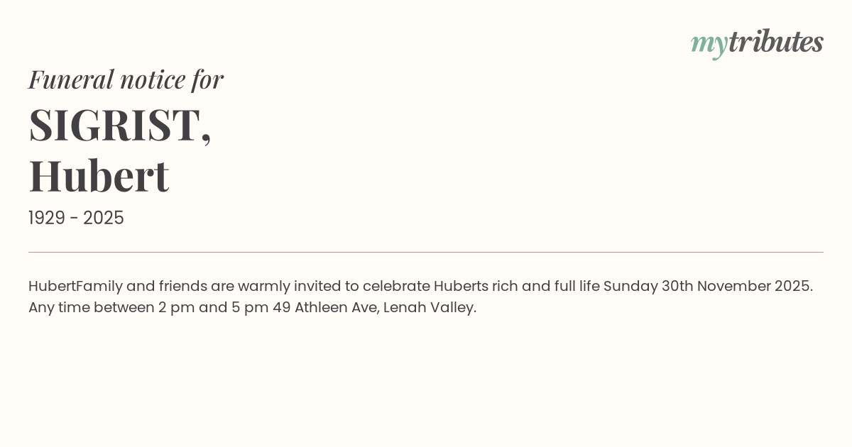Family and friends are warmly invited to celebrate Hubert‘s rich and full life Sunday 30th November 2025.