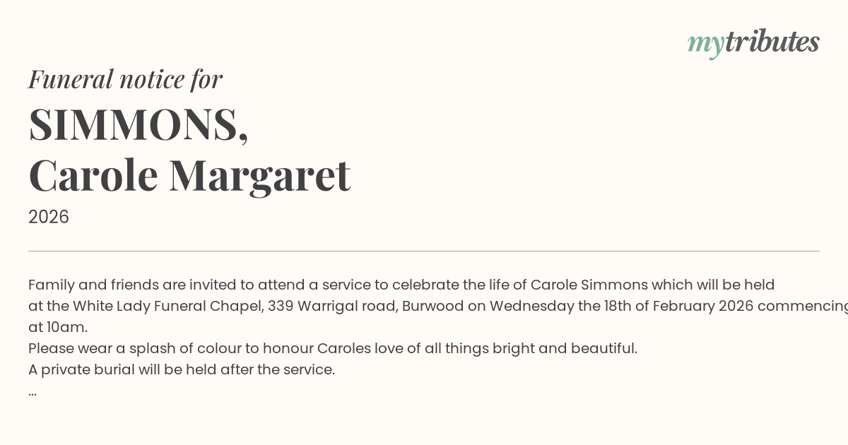 Family and friends are invited to attend a service to celebrate the life of Carole Simmons which will be held at the White Lady Funeral Chapel, 339 Warrigal road, Burwood on Wednesday the 18th of February 2026 commencing at 10am.