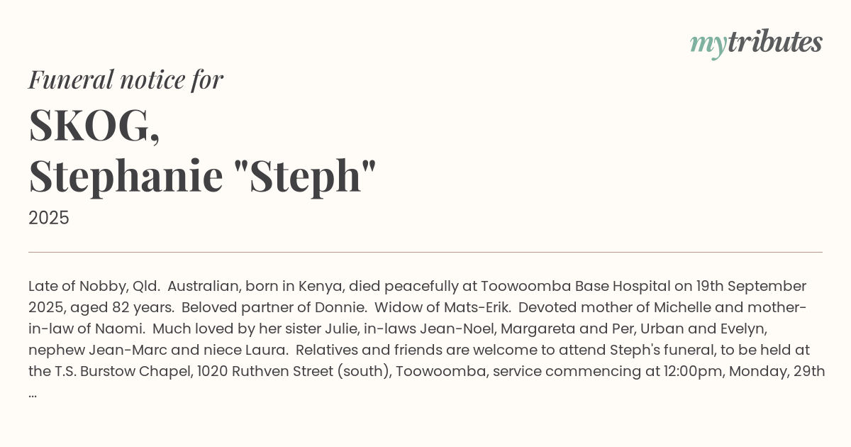 Relatives and friends are welcome to attend Steph's funeral, to be held at the T.S. Burstow Chapel, 1020 Ruthven Street (south), Toowoomba, service commencing at 12:00pm, Monday, 29th September 2025.