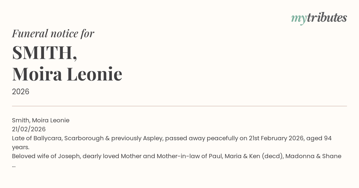Late of Ballycara, Scarborough & previously Aspley, passed away peacefully on 21st February 2026, aged 94 years.