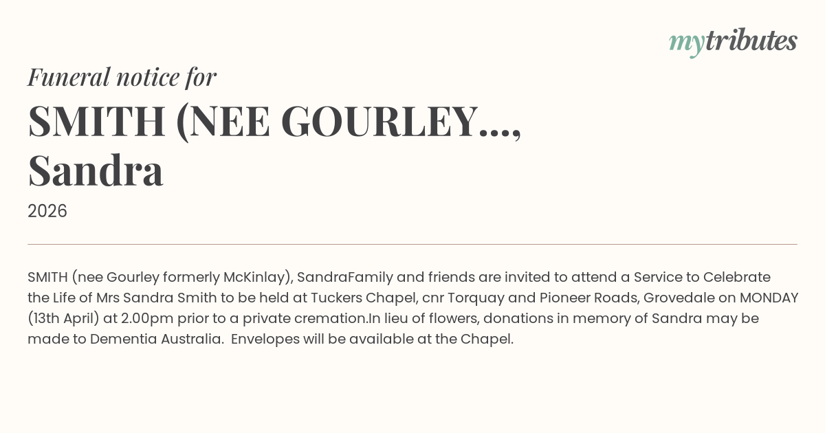 Family and friends are invited to attend a Service to Celebrate the Life of Mrs Sandra Smith to be held at Tuckers Chapel, cnr Torquay and Pioneer Roads, Grovedale on MONDAY (13th April) at 2.00pm prior to a private cremation.