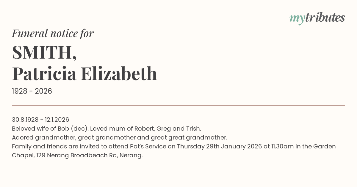 Family and friends are invited to attend Pat's Service on Thursday 29th January 2026 at 11.30am in the Garden Chapel, 129 Nerang Broadbeach Rd, Nerang.