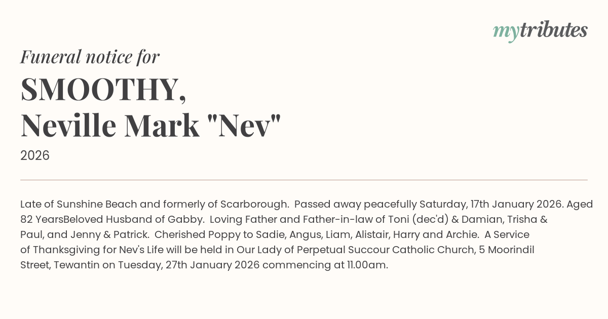 Beloved Husband of Gabby. Loving Father and Father-in-law of Toni (dec'd) & Damian, Trisha & Paul, and Jenny & Patrick. Cherished Poppy to Sadie, Angus, Liam, Alistair, Harry and Archie. A Service of Thanksgiving for Nev's Life will be held in Our Lady of Perpetual Succour Catholic Church, 5 Moorindil Street, Tewantin on Tuesday, 27th January 2026 commencing at 11.00am.