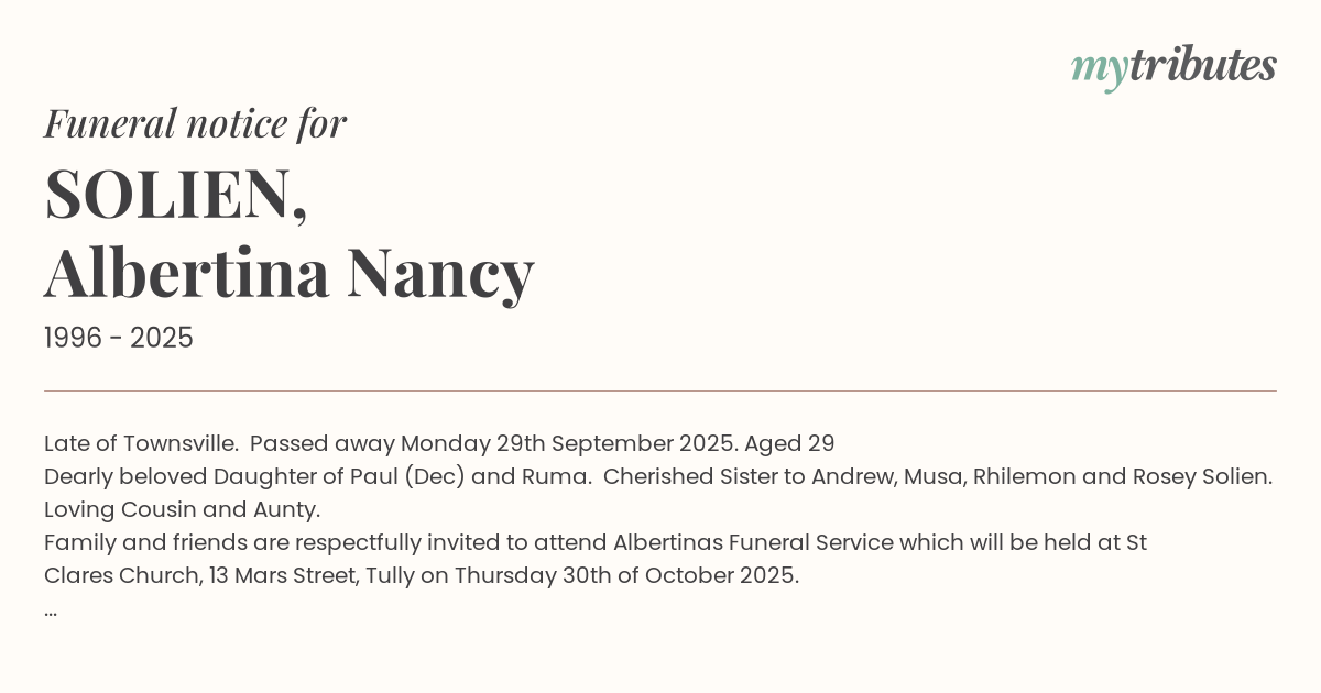Family and friends are respectfully invited to attend Albertina’s Funeral Service which will be held at St Clare’s Church, 13 Mars Street, Tully on Thursday 30th of October 2025.