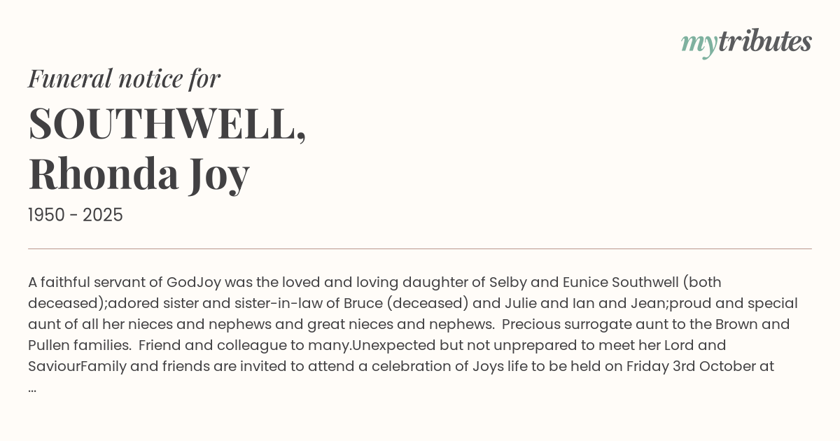 Joy was the loved and loving daughter of Selby and Eunice Southwell (both deceased);
