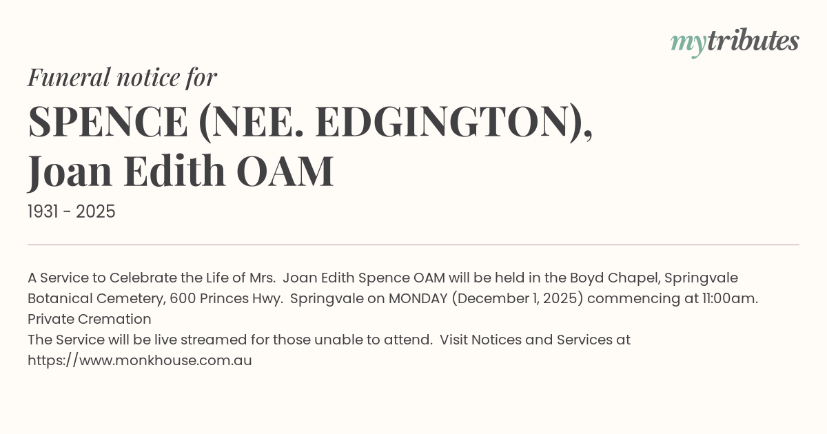 A Service to Celebrate the Life of Mrs. Joan Edith Spence OAM will be held in the Boyd Chapel, Springvale Botanical Cemetery, 600 Princes Hwy. Springvale on MONDAY (December 1, 2025) commencing at 11:00am.