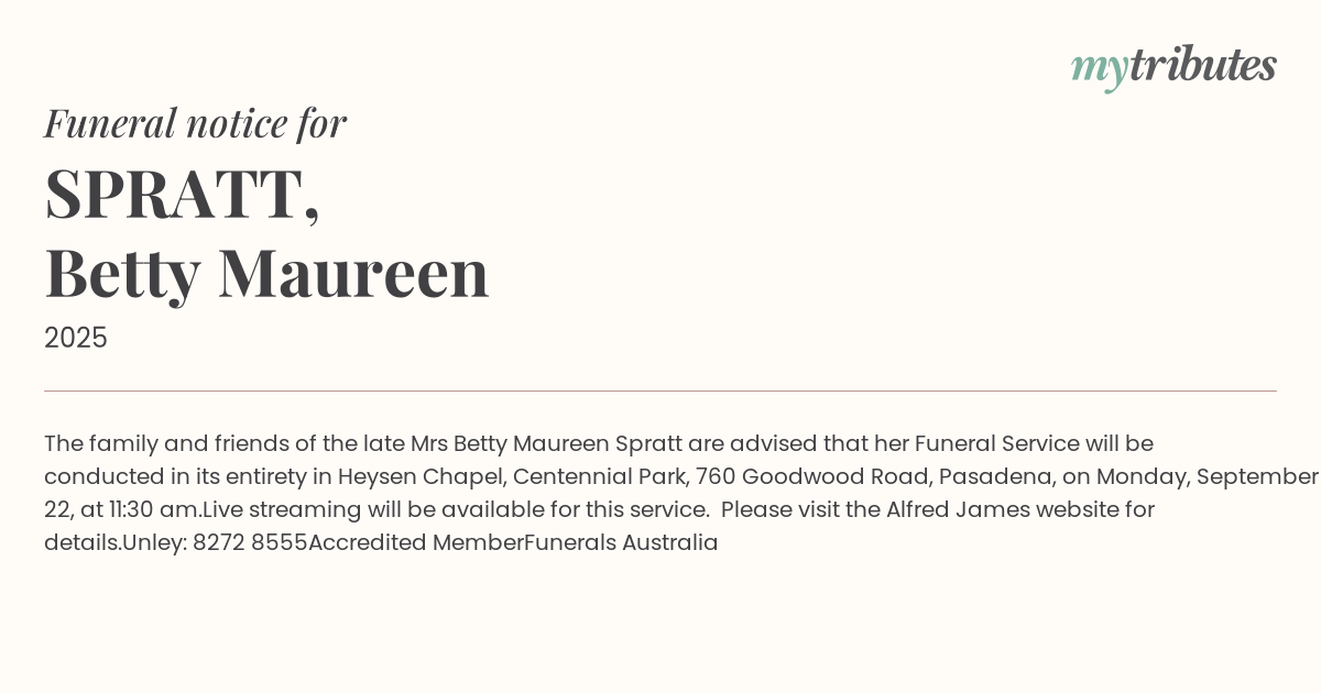 The family and friends of the late Mrs Betty Maureen Spratt are advised that her Funeral Service will be conducted in its entirety in Heysen Chapel, Centennial Park, 760 Goodwood Road, Pasadena, on Monday, September 22, at 11:30 am.