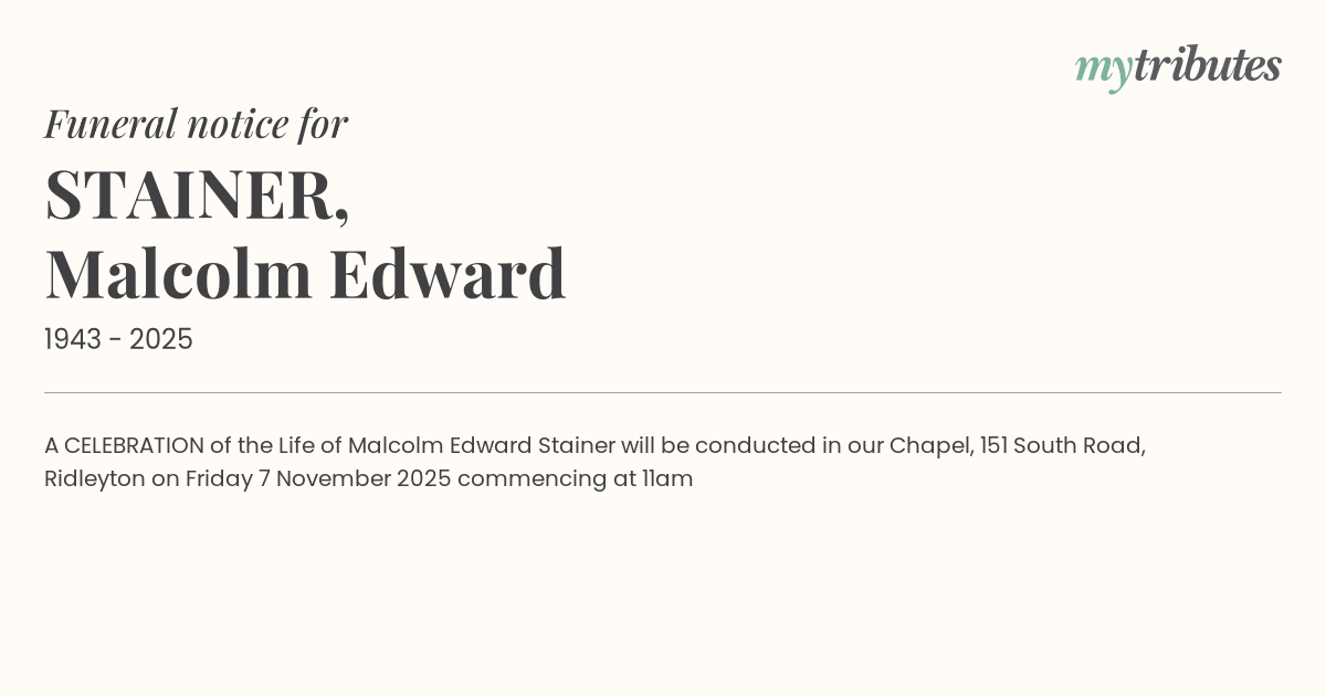 A CELEBRATION of the Life of Malcolm Edward Stainer will be conducted in our Chapel, 151 South Road,