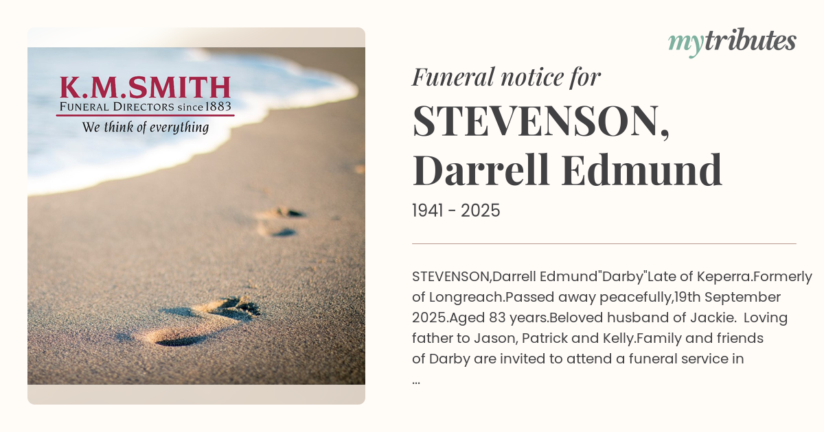 Family and friends of Darby are invited to attend a funeral service in Lakeview Chapel, Albany Creek Memorial Park, 400 Albany Creek Road, Bridgeman Downs, on Monday, 29th September, commencing at 11.00 a.m.