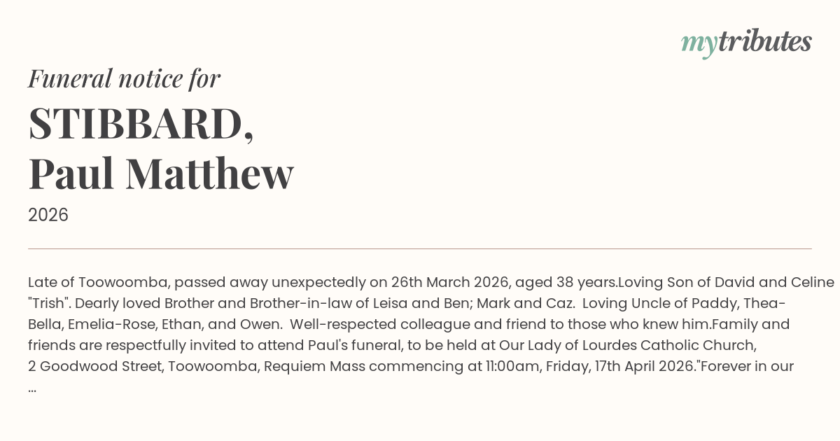 Family and friends are respectfully invited to attend Paul's funeral, to be held at Our Lady of Lourdes Catholic Church, 2 Goodwood Street, Toowoomba, Requiem Mass commencing at 11:00am, Friday, 17th April 2026.