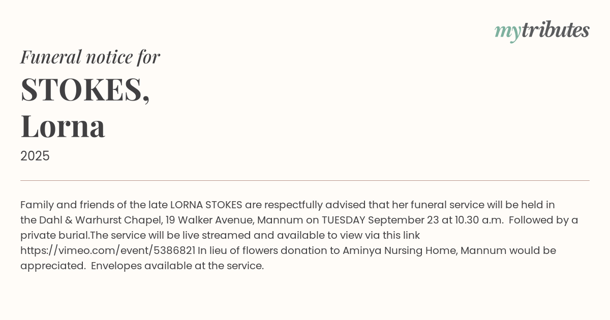 Family and friends of the late LORNA STOKES are respectfully advised that her funeral service will be held in the Dahl & Warhurst Chapel, 19 Walker Avenue, Mannum on TUESDAY September 23 at 10.30 a.m. Followed by a private burial.