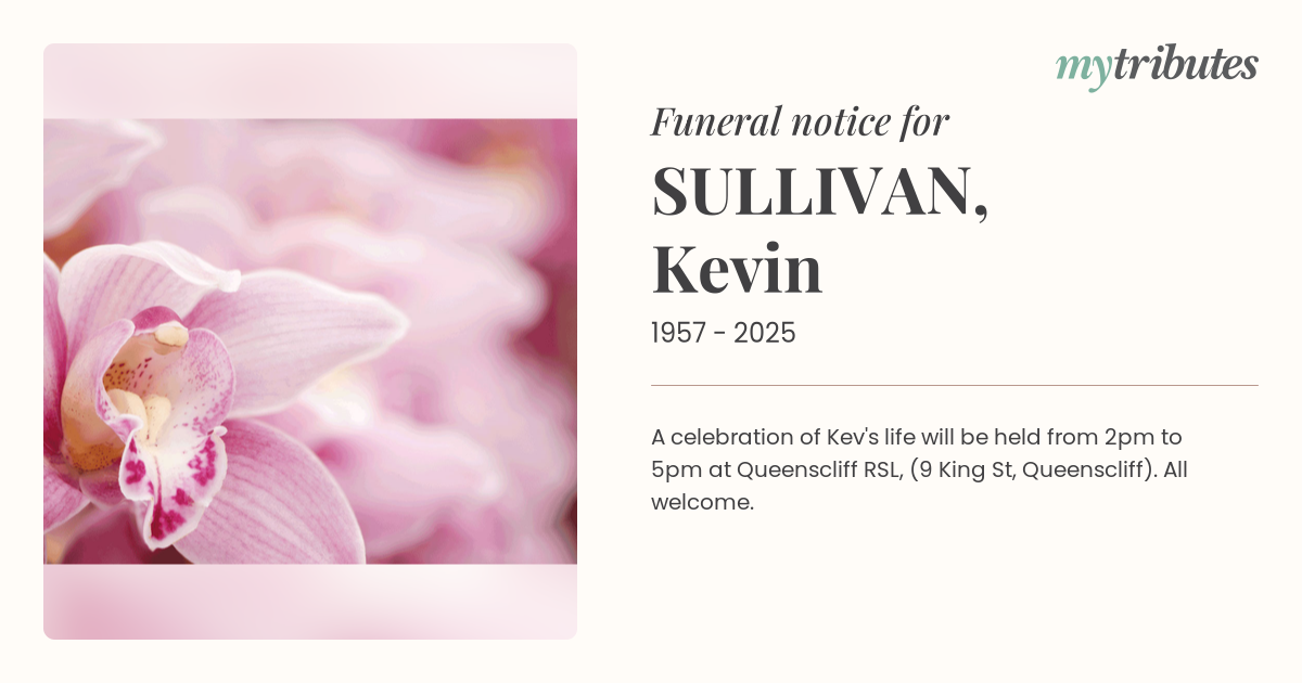 A celebration of Kev's life will be held from 2pm to 5pm at Queenscliff RSL, (9 King St, Queenscliff). All welcome.