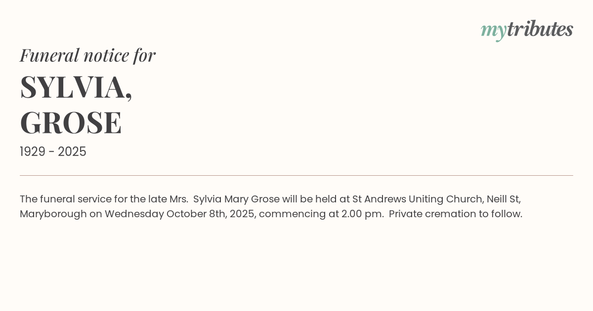 The funeral service for the late Mrs. Sylvia Mary Grose will be held at St Andrews Uniting Church, Neill St, Maryborough on Wednesday October 8th, 2025, commencing at 2.00 pm. Private cremation to follow.
