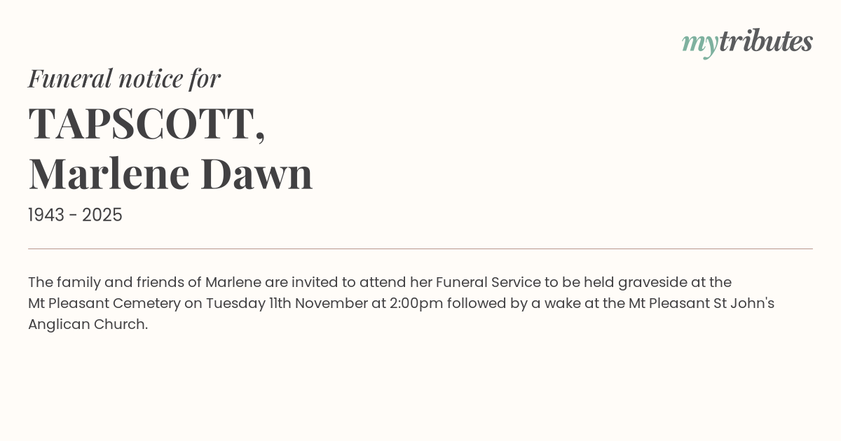 The family and friends of Marlene are invited to attend her Funeral Service to be held graveside at the