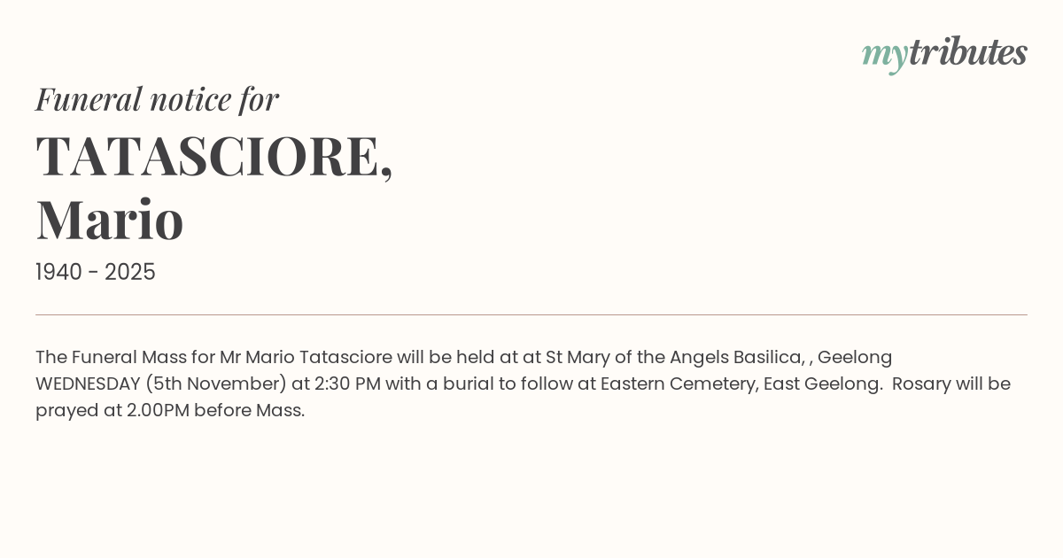 The Funeral Mass for Mr Mario Tatasciore will be held at at St Mary of the Angels Basilica, , Geelong WEDNESDAY (5th November) at 2:30 PM with a burial to follow at Eastern Cemetery, East Geelong. Rosary will be prayed at 2.00PM before Mass.