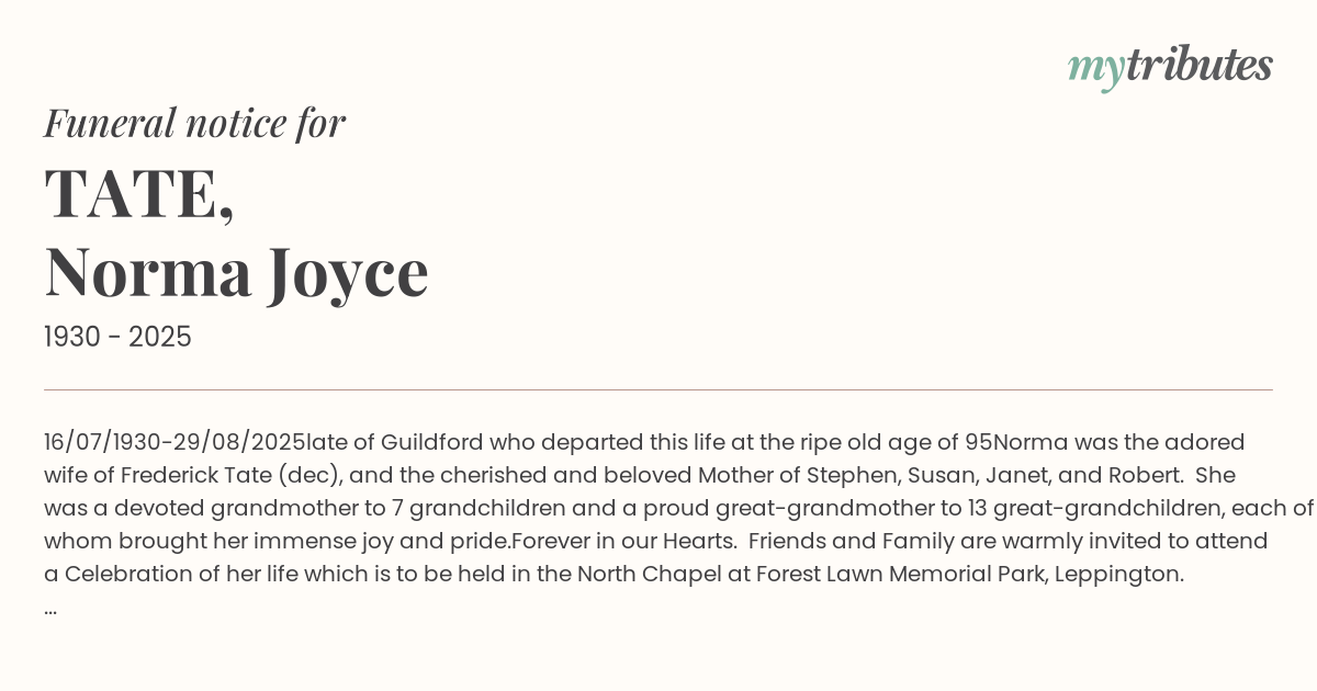 attend a Celebration of her life which is to be held in the North Chapel at Forest Lawn Memorial Park, Leppington.