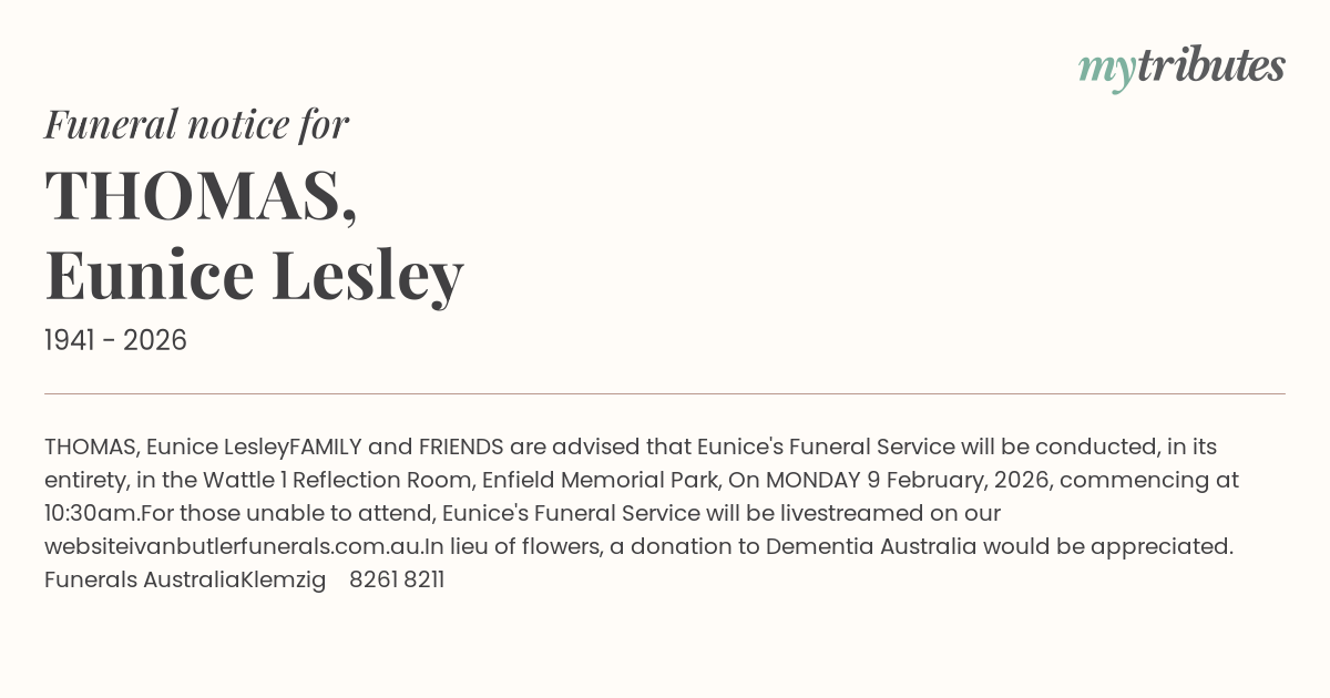 For those unable to attend, Eunice's Funeral Service