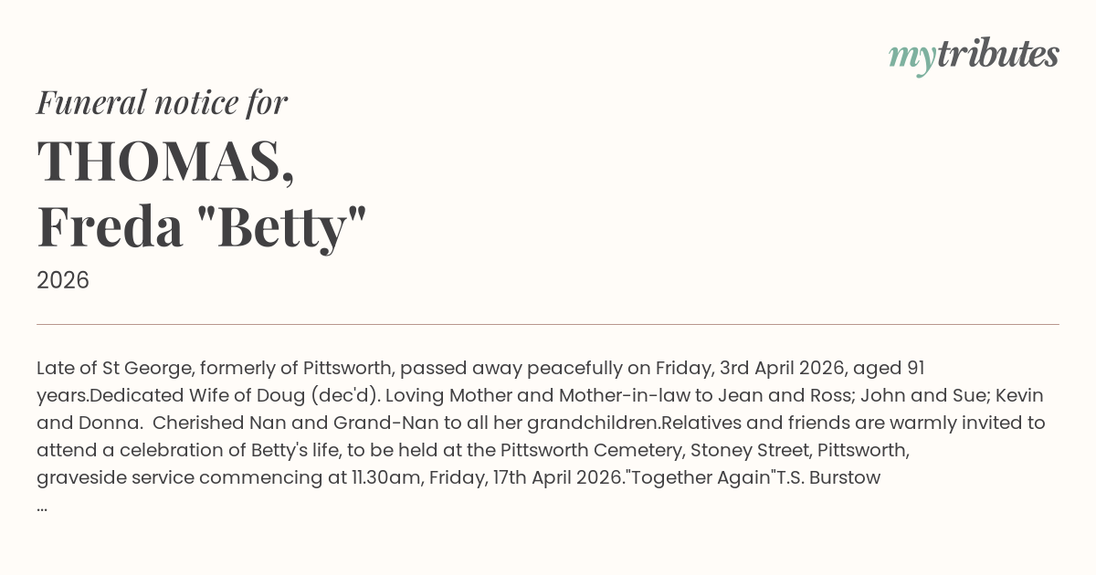 Relatives and friends are warmly invited to attend a celebration of Betty's life, to be held at the Pittsworth Cemetery, Stoney Street, Pittsworth, graveside service commencing at 11.30am, Friday, 17th April 2026.