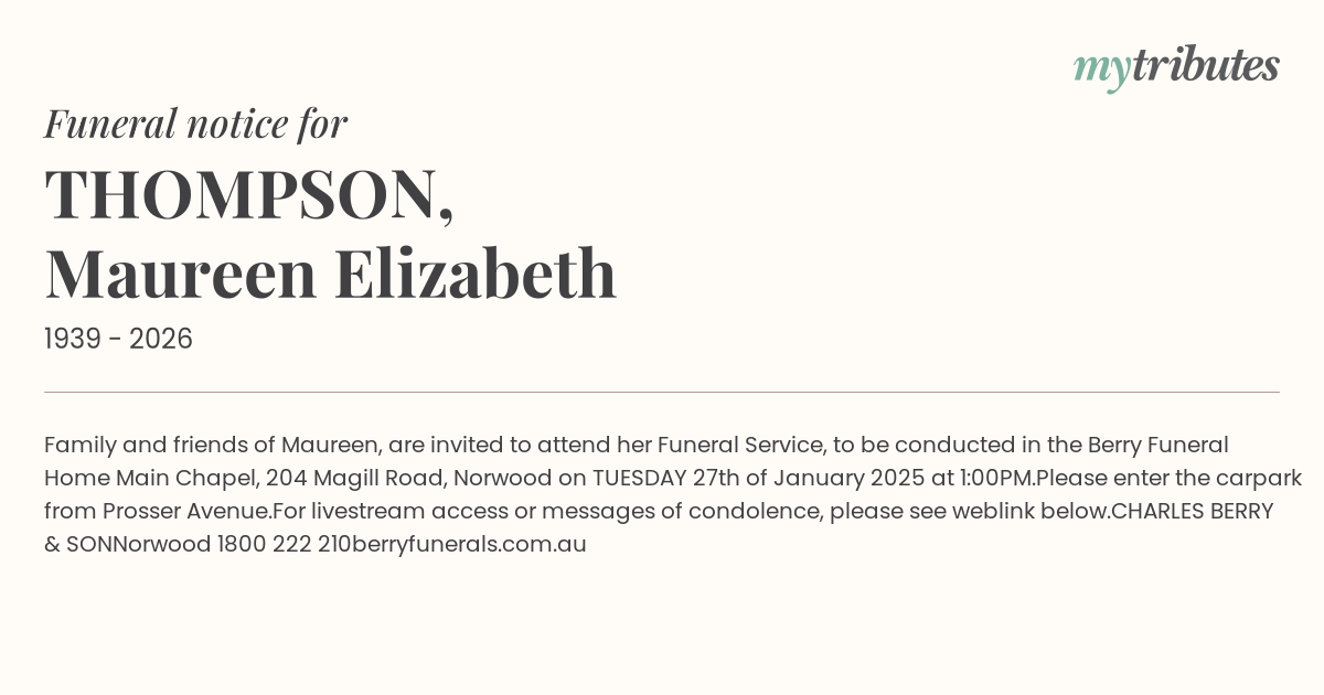 Family and friends of Maureen, are invited to attend her Funeral Service, to be conducted in the Berry Funeral Home Main Chapel, 204 Magill Road, Norwood on TUESDAY 27th of January 2025 at 1:00PM.