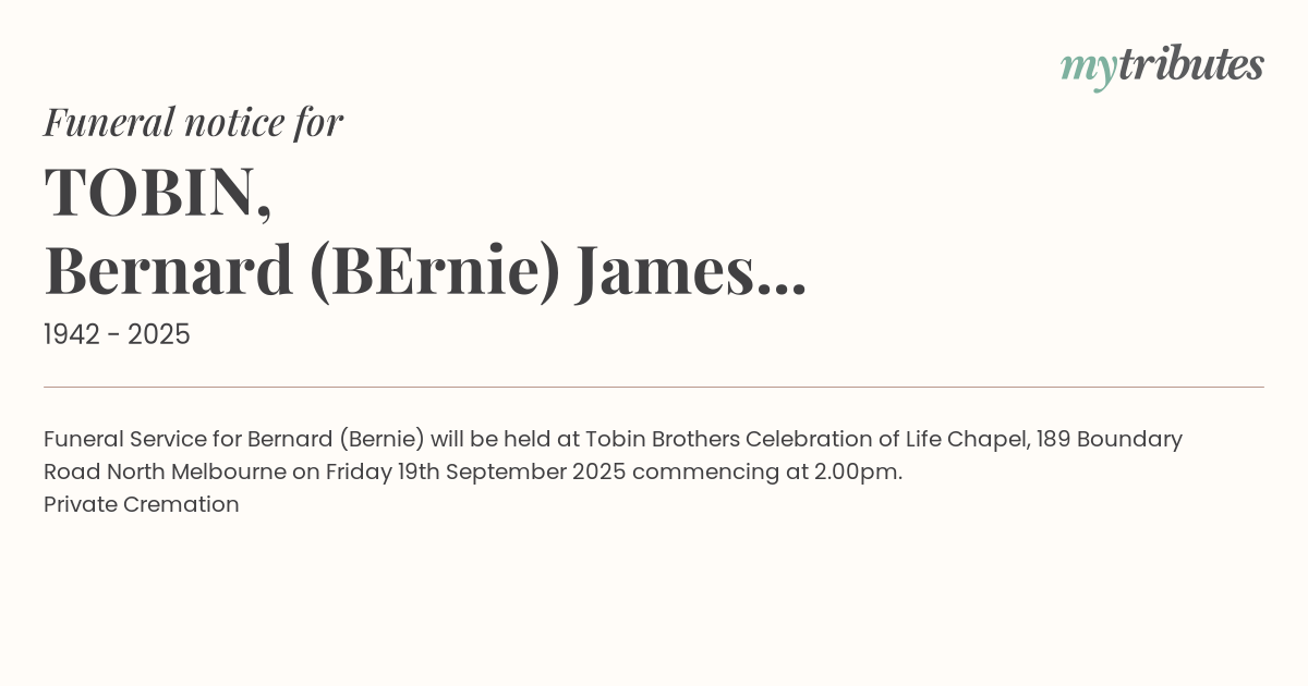 Funeral Service for Bernard (Bernie) will be held at Tobin Brothers Celebration of Life Chapel, 189 Boundary Road North Melbourne on Friday 19th September 2025 commencing at 2.00pm.