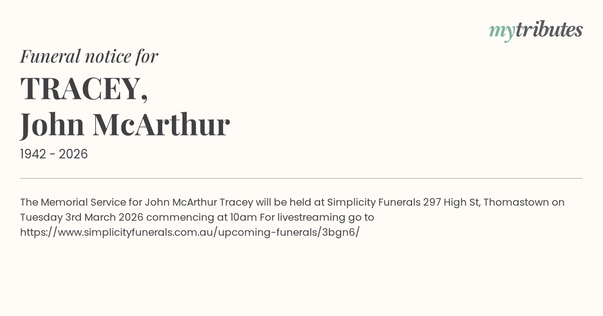 The Memorial Service for John McArthur Tracey will be held at Simplicity Funerals 297 High St, Thomastown on Tuesday 3rd March 2026 commencing at 10am
