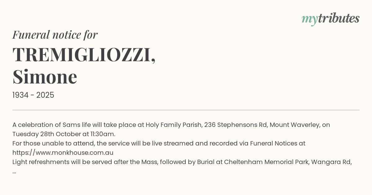 For those unable to attend, the service will be live streamed and recorded via Funeral Notices at https://www.monkhouse.com.au