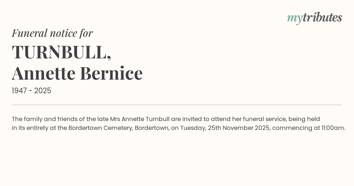 The family and friends of the late Mrs Annette Turnbull are invited to attend her funeral service, being held in its entirety at the Bordertown Cemetery, Bordertown, on Tuesday, 25th November 2025, commencing at 11:00am.
