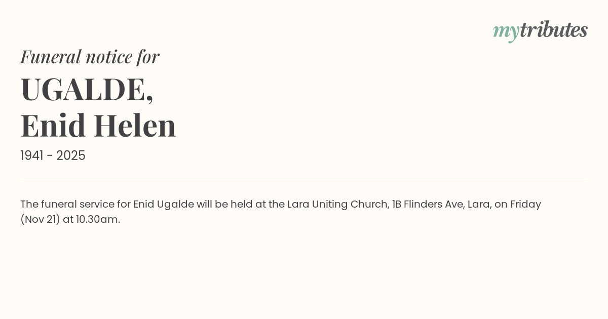 The funeral service for Enid Ugalde will be held at the Lara Uniting Church, 1B Flinders Ave, Lara, on Friday (Nov 21) at 10.30am.