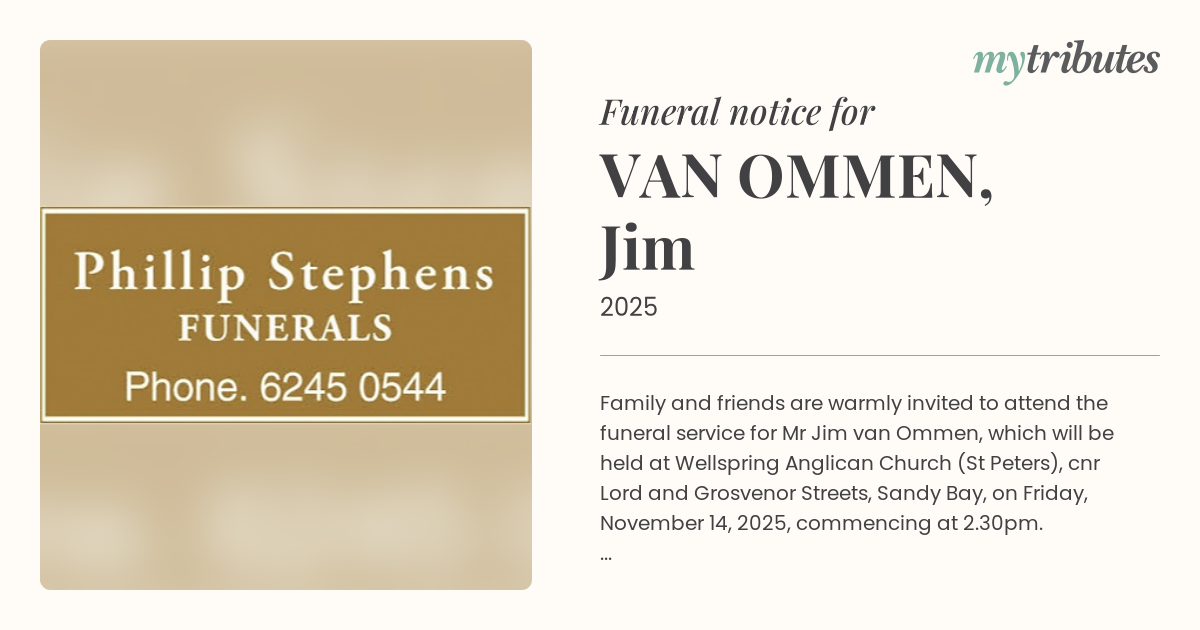 Family and friends are warmly invited to attend the funeral service for Mr Jim van Ommen, which will be held at Wellspring Anglican Church (St Peters), cnr Lord and Grosvenor Streets, Sandy Bay, on Friday, November 14, 2025, commencing at 2.30pm.