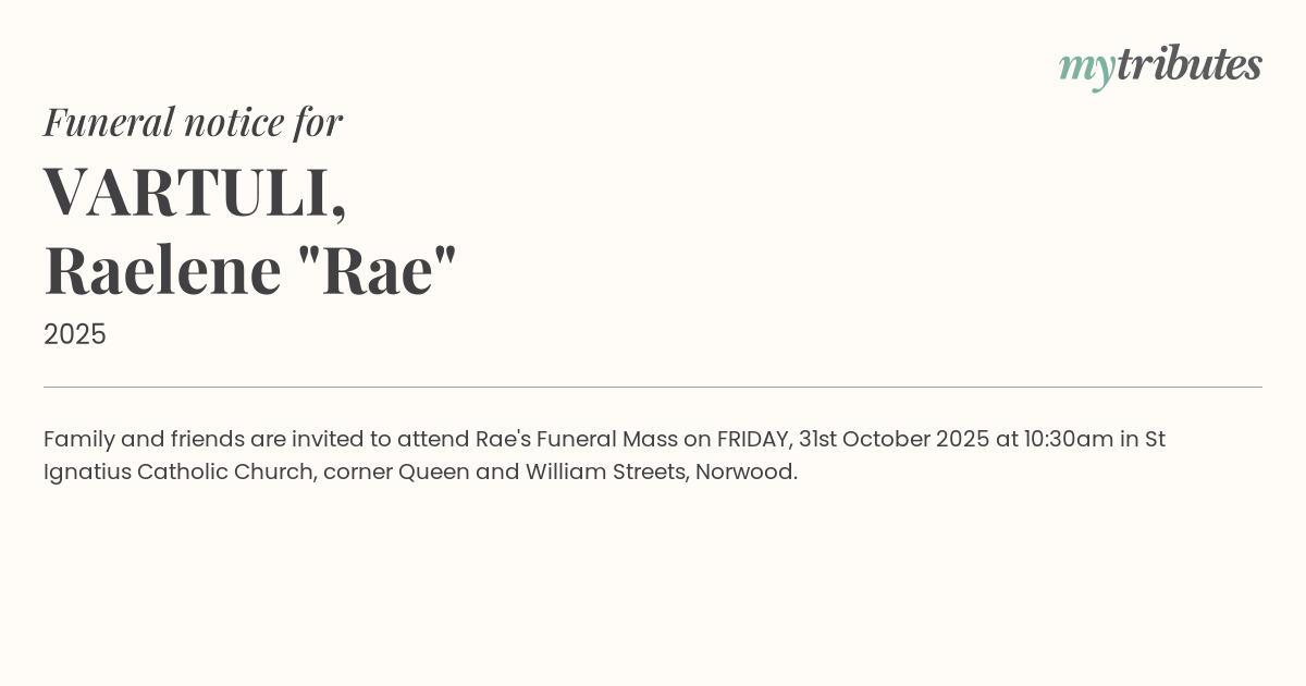 Family and friends are invited to attend Rae's Funeral Mass on FRIDAY, 31st October 2025 at 10:30am in St Ignatius Catholic Church, corner Queen and William Streets, Norwood.