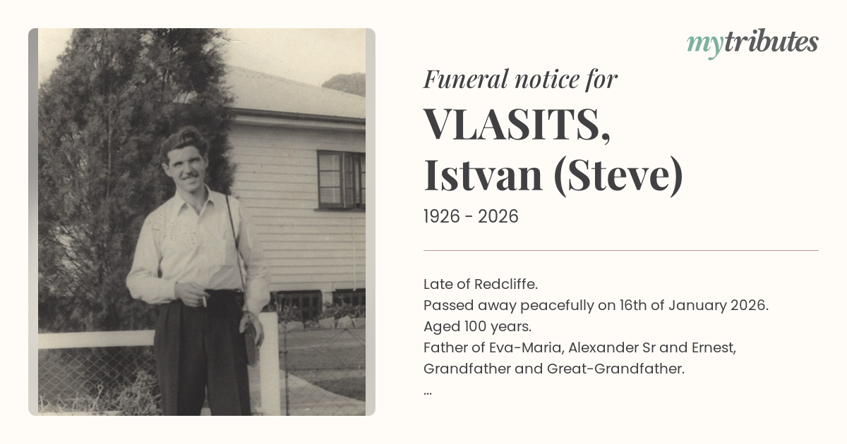 Family and friends are warmly invited to a service for Istvan (Steve) on Monday 2nd of February at the Eileen Hartnett Chapel, 19-21 Anzac Ave Redcliffe starting at 2pm.