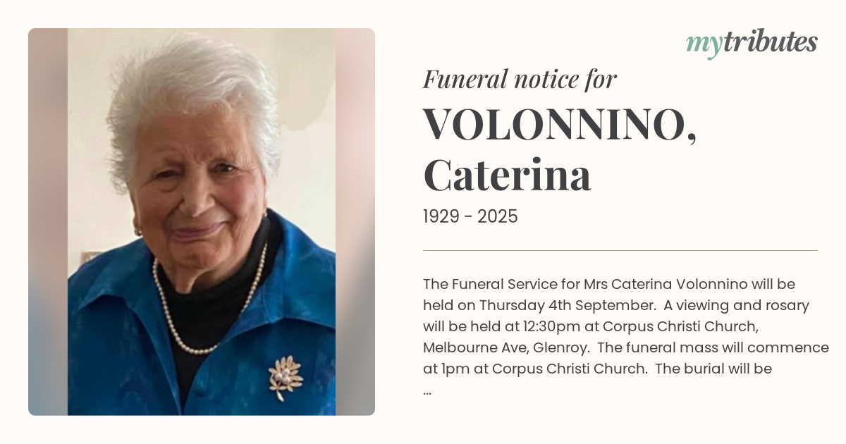 The Funeral Service for Mrs Caterina Volonnino will be held on Thursday 4th September. A viewing and rosary will be held at 12:30pm at Corpus Christi Church, Melbourne Ave, Glenroy. The funeral mass will commence at 1pm at Corpus Christi Church. The burial will be held at Williamstown Cemetery at 3:00pm.