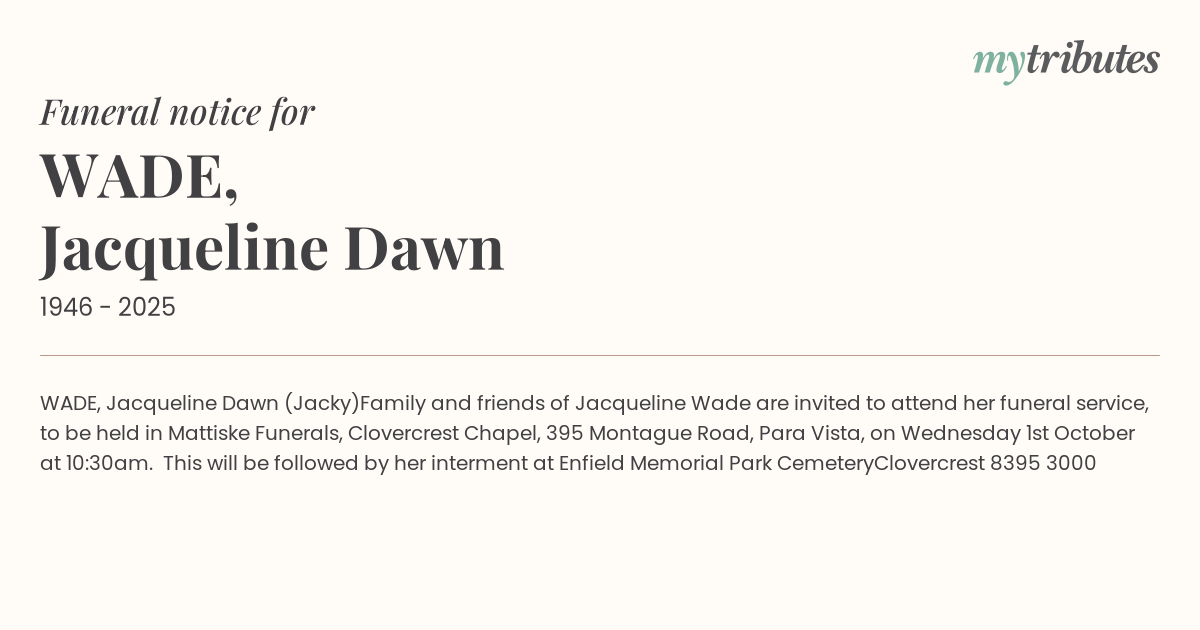 Family and friends of Jacqueline Wade are invited to attend her funeral service, to be