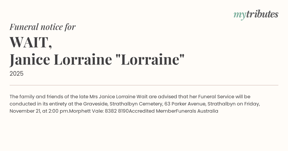 The family and friends of the late Mrs Janice Lorraine Wait are advised that her Funeral Service will be conducted in its entirety at the Graveside, Strathalbyn Cemetery, 63 Parker Avenue, Strathalbyn on Friday, November 21, at 2:00 pm.