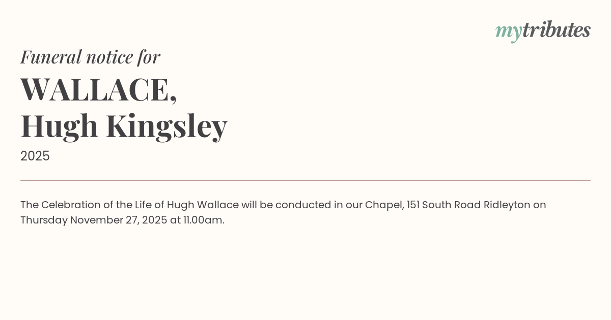 The Celebration of the Life of Hugh Wallace will be conducted in our Chapel, 151 South Road Ridleyton on Thursday November 27, 2025 at 11.00am.